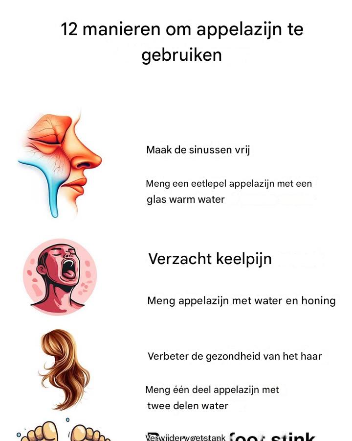 Appelazijn kan helpen bij het vrijmaken van bijholten dankzij het vermogen om slijm op te lossen en de antibacteriële eigenschappen. Om het te gebruiken voor verlichting van bijholteontstekingen, meng je een eetlepel appelazijn met een glas warm water en drink je dit op. Dit kan het slijm verdunnen, waardoor het gemakkelijker wordt om uit te scheiden en de verstopping van de bijholten vermindert. Sommige mensen inhaleren ook de stoom van heet water gemengd met appelazijn om hun neusholten vrij te maken.