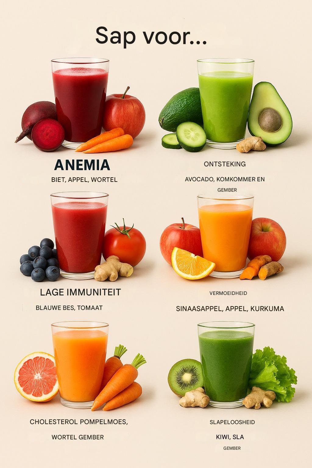 In deze gids delen we zes saprecepten die speciaal zijn ontworpen om veelvoorkomende problemen zoals bloedarmoede, ontstekingen, vermoeidheid, een slechte immuniteit, een hoog cholesterolgehalte en slapeloosheid te verlichten. Of u zich nu energieker wilt voelen, beter wilt slapen of uw lichaam gewoon de voedingsstoffen wilt geven die het nodig heeft: deze sappen zijn iets voor u.