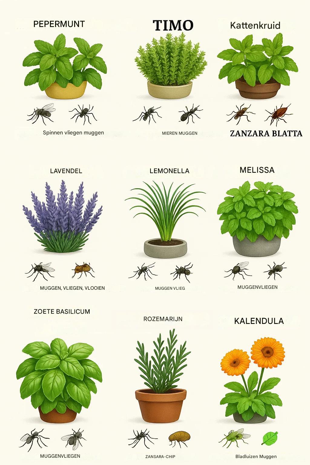 Pepermunt. Hoewel de plant een aangename geur heeft, is het een van de meest effectieve planten om spinnen en muggen af te weren.