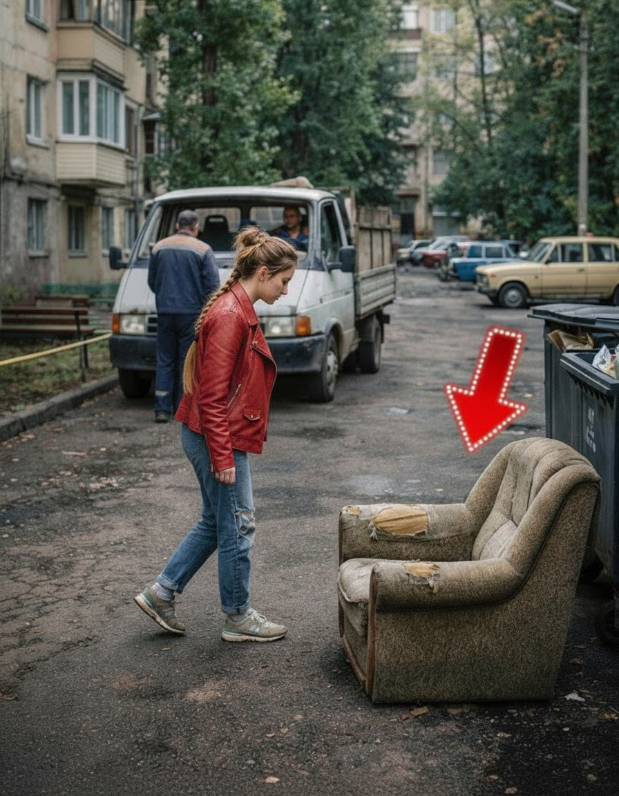 Emma ging op een avond het vuilnis buiten zetten. De tuin was gewoon, stil en grijs. Een oude bank en een paar vuilniszakken stonden bij de afvalcontainers. Op dat moment stopte er een kleine vrachtwagen bij de container. Twee mannen stapten uit, laadden snel de gehavende stoel uit en reden weg zonder om te kijken.