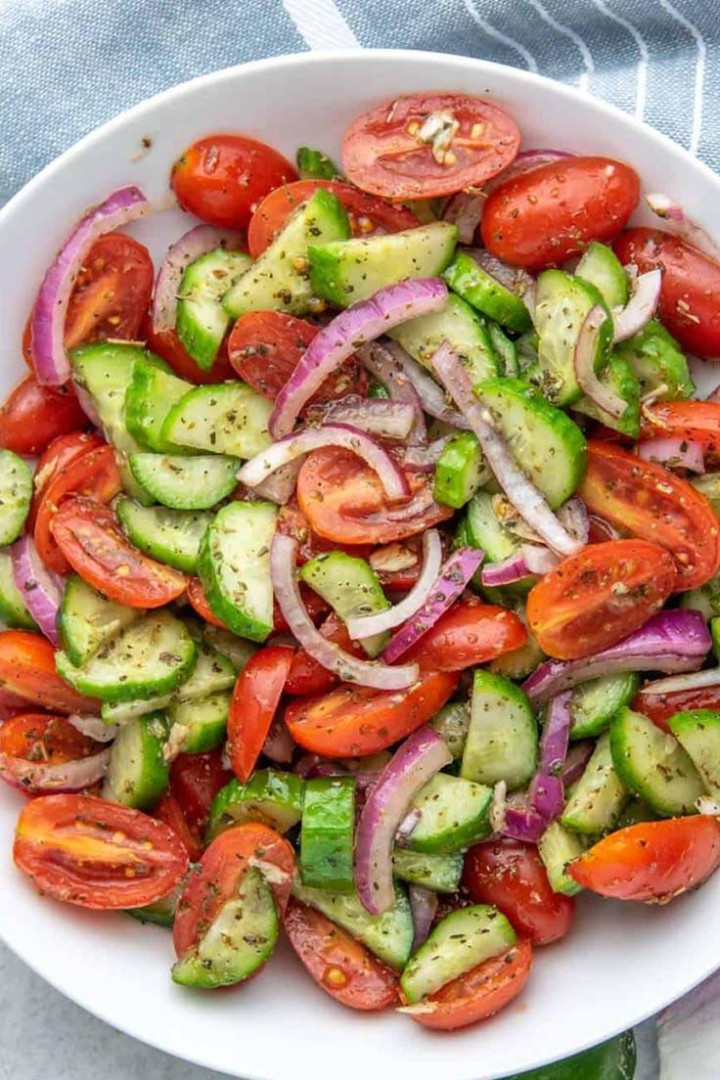 Deze komkommer-tomatensalade belichaamt de eenvoud en frisheid van de zomer. Met zijn knapperige, zonovergoten groenten en lichte vinaigrette is het de perfecte begeleider van een terrasmaaltijd of een verfrissend voorgerecht op warme dagen.