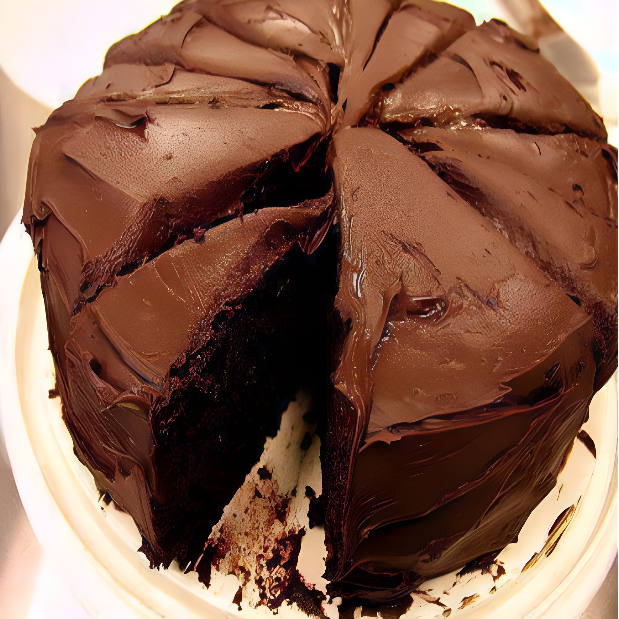 Ingrediënten: – 200 g chocolade – 125 g bloem – 3 eieren – 1 zakje gist – 125 g suiker – 125 g boter – voor de ganache: 200 g volle melk of volle room 30% mg (of halve melk en halve room) – 200 g banketbakkerschocolade Bereiding: