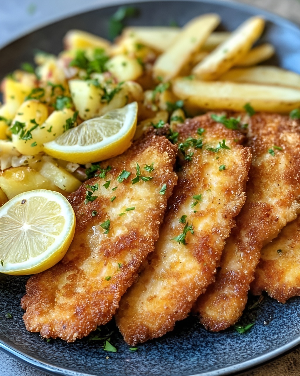 Ingrediënten (voor 4 personen): 🥩 4 kalfsschnitzels 🥚 2 eieren 🍞 100 g paneermeel 🧂 Zout en peper naar smaak 🍋 Partjes citroen om te serveren 🌿 Peterselie voor garnering 🧈 Boter of olie om te bakken Bereiding: 1. Bereid de kalfsschnitzels voor: De kalfsschnitzels moeten bij voorkeur al in gelijkmatige, dunne plakken zijn … Lire plus