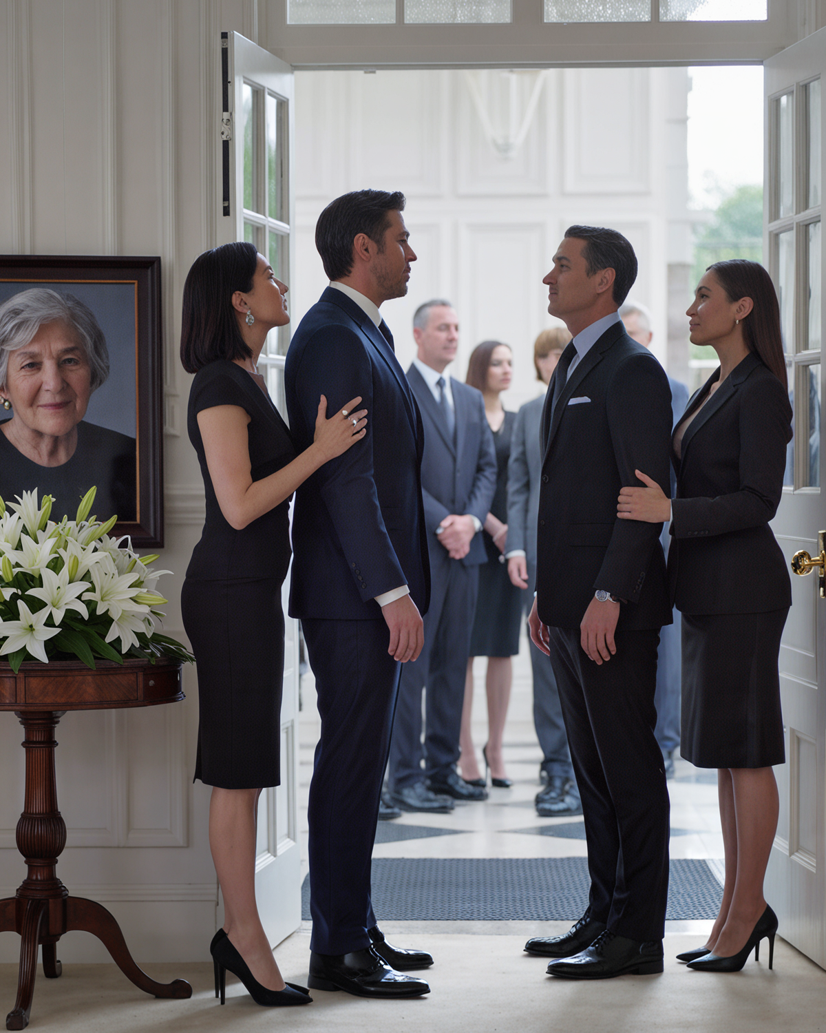 Zachary stapte opzij om met de begrafenisondernemer te praten. « Ik moet even onder vier ogen met je praten, » zei Stephanie, knikkend naar een zijkamer. Tegen beter weten in volgde ik haar – gewoon om een ​​scène te vermijden.