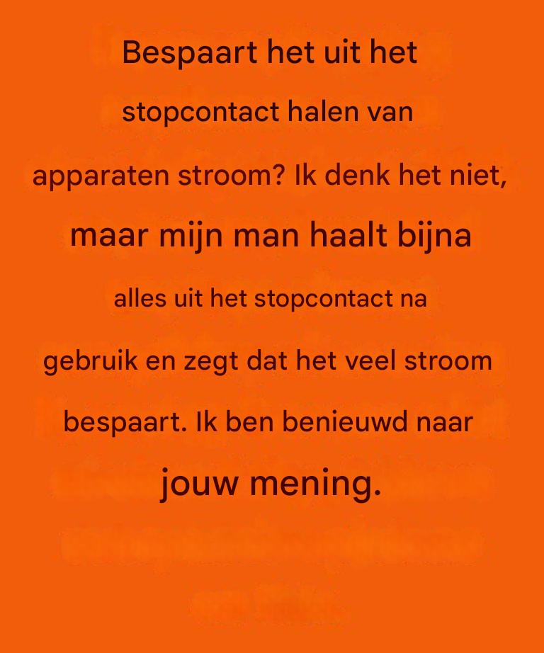 Je telefoonoplader? In het stopcontact, maar zonder telefoon? Die verbruikt nog steeds stroom.