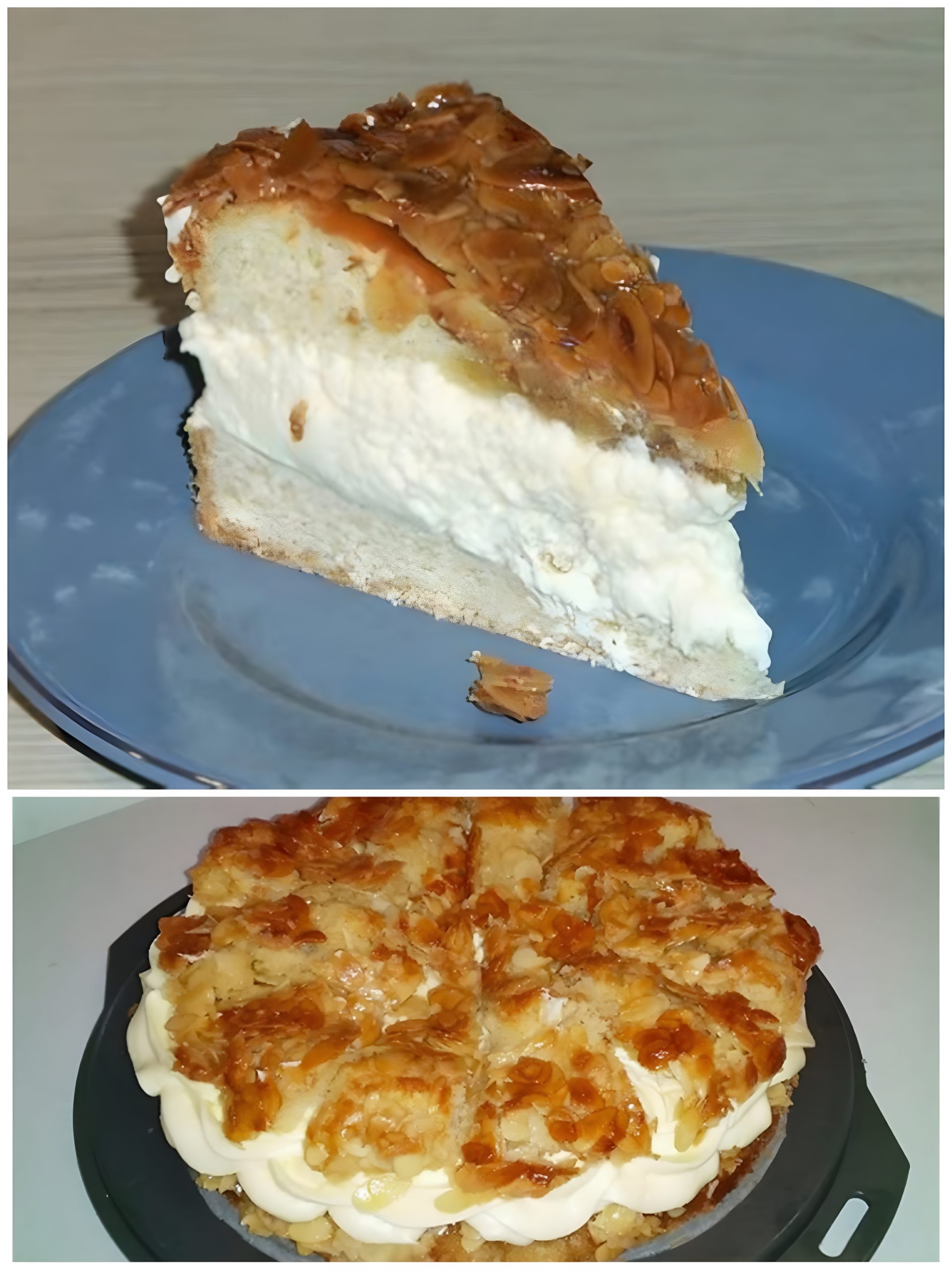 Een luchtige taart met een knapperige honing-amandellaag en een romige vanillevulling. Perfect voor een feestje of een speciale gelegenheid!
