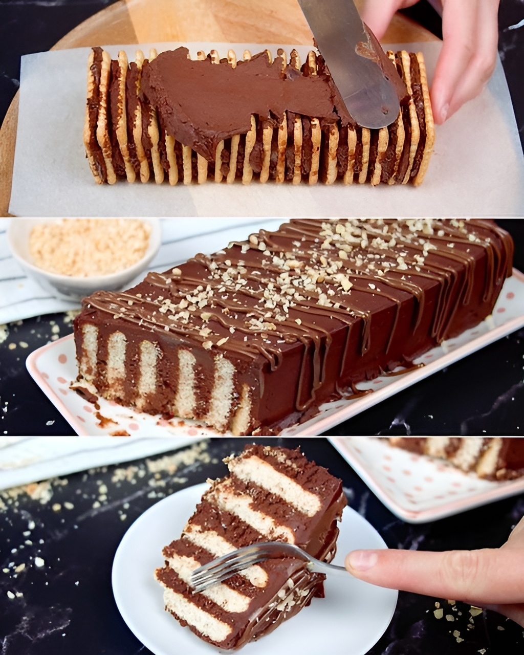 De heerlijke koekjes en chocoladetaart zijn een van de lekkerste desserts ter wereld. Het bestaat uit lagen droge koekjes, romige ganache en een decoratie van slagroom en gehakte hazelnoten. Perfect als recept of als dessert om gasten mee te voirssen!