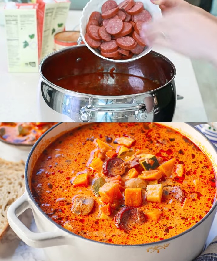 Romige zoete aardappel-, worst- en groentesoep