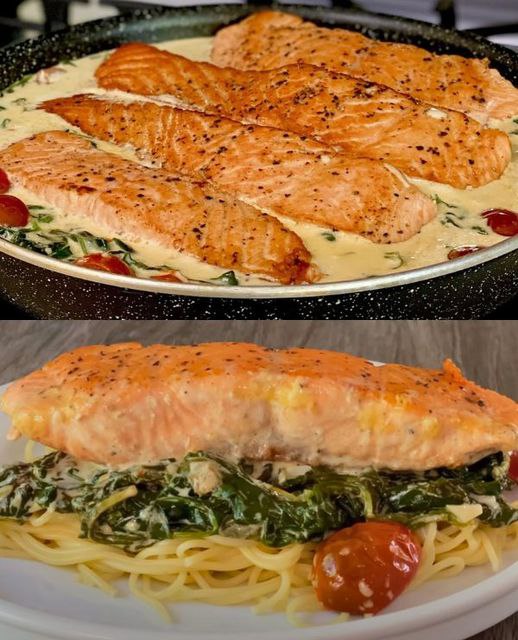 Ingrediënten: Een groot stuk zalm, in vier kleinere stukken gesneden, zonder vel. Kruiden: zout en zwarte peper. Boter voor het bakken van vis. 12 kleine tomaten. 2 teentjes knoflook, gehakt. 400 g verse spinazie. 1 theelepel droge ui. 250 ml neutrale vloeibare crème. 40 g kaas, geraspt. 1 eetlepel geraspte Parmezaanse kaas. Instructies: Bereid de … Lire plus