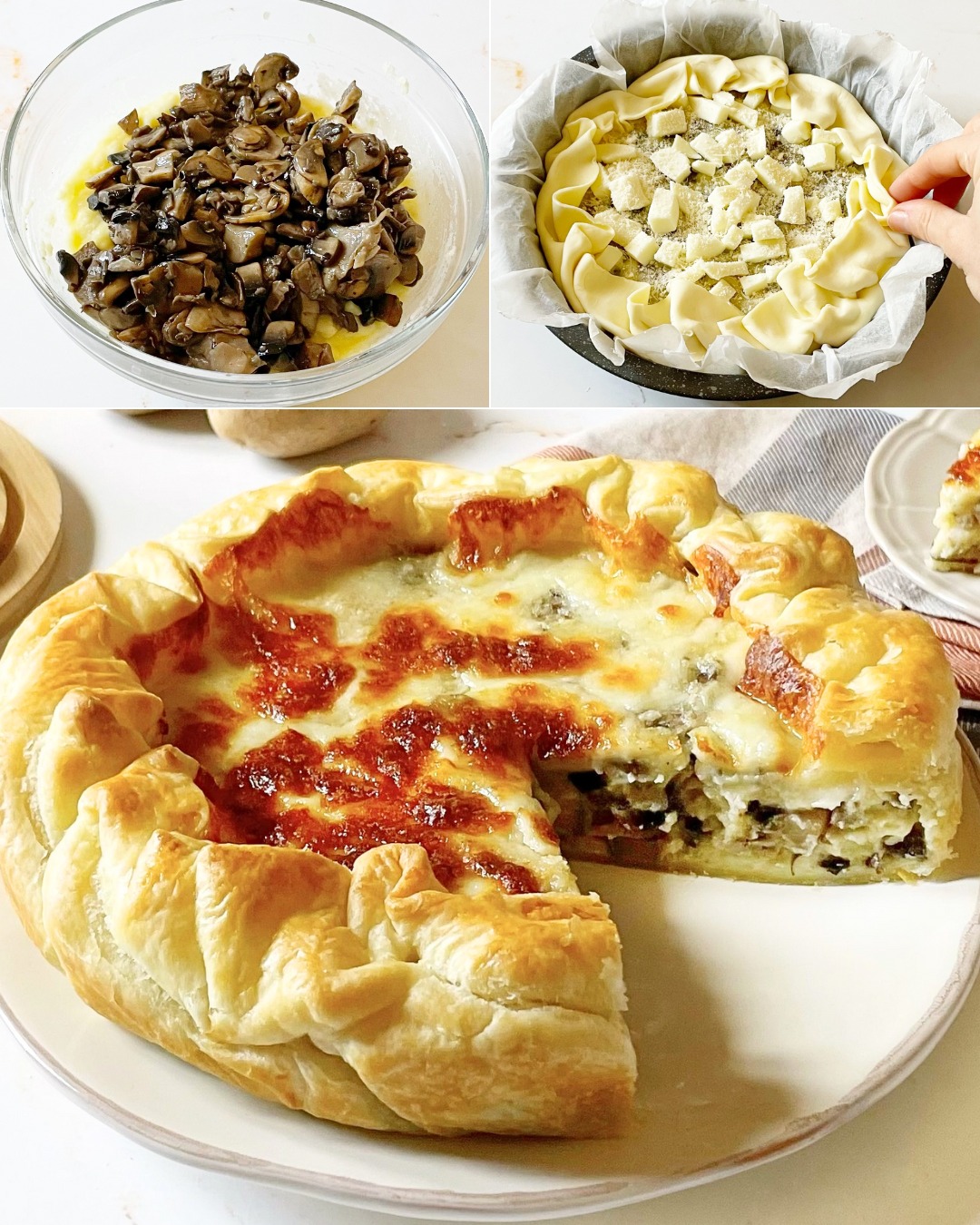 Een hartige, romige taart vol met aardappelen, champignons en Parmezaanse kaas!