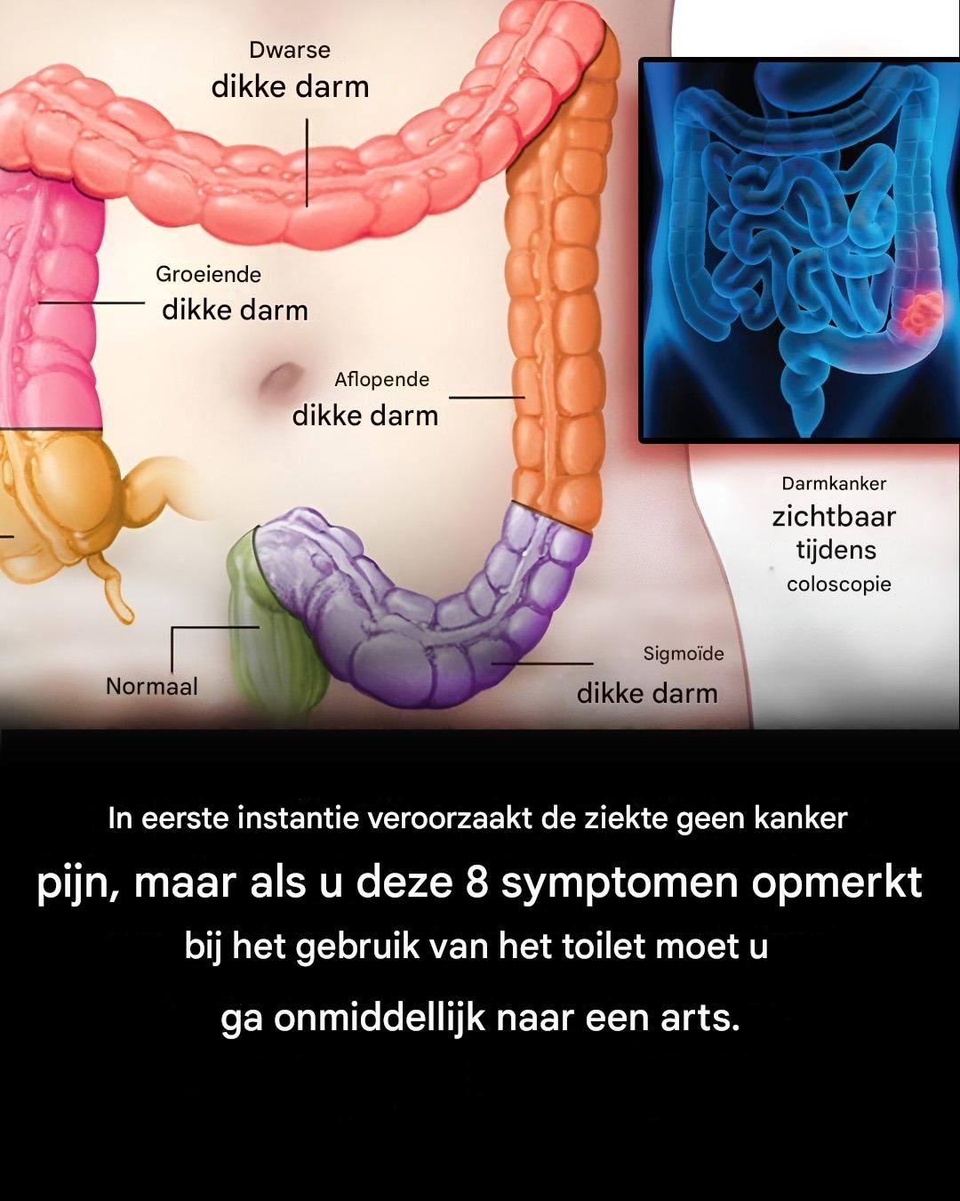 Darmkanker veroorzaakt in een vroeg stadium doorgaans geen merkbare symptomen, maar er zijn zeven symptomen die zich in een vroeg stadium kunnen manifesteren en die sommige mensen negeren. Deze symptomen zijn onder andere veranderingen in de stoelgang (zoals constipatie, diarree of afwisselende stoelgang), bloed in de ontlasting, buikkrampen en -pijn, misselijkheid en braken, onverklaarbaar gewichtsverlies, verlies van eetlust en algemene vermoeidheid.