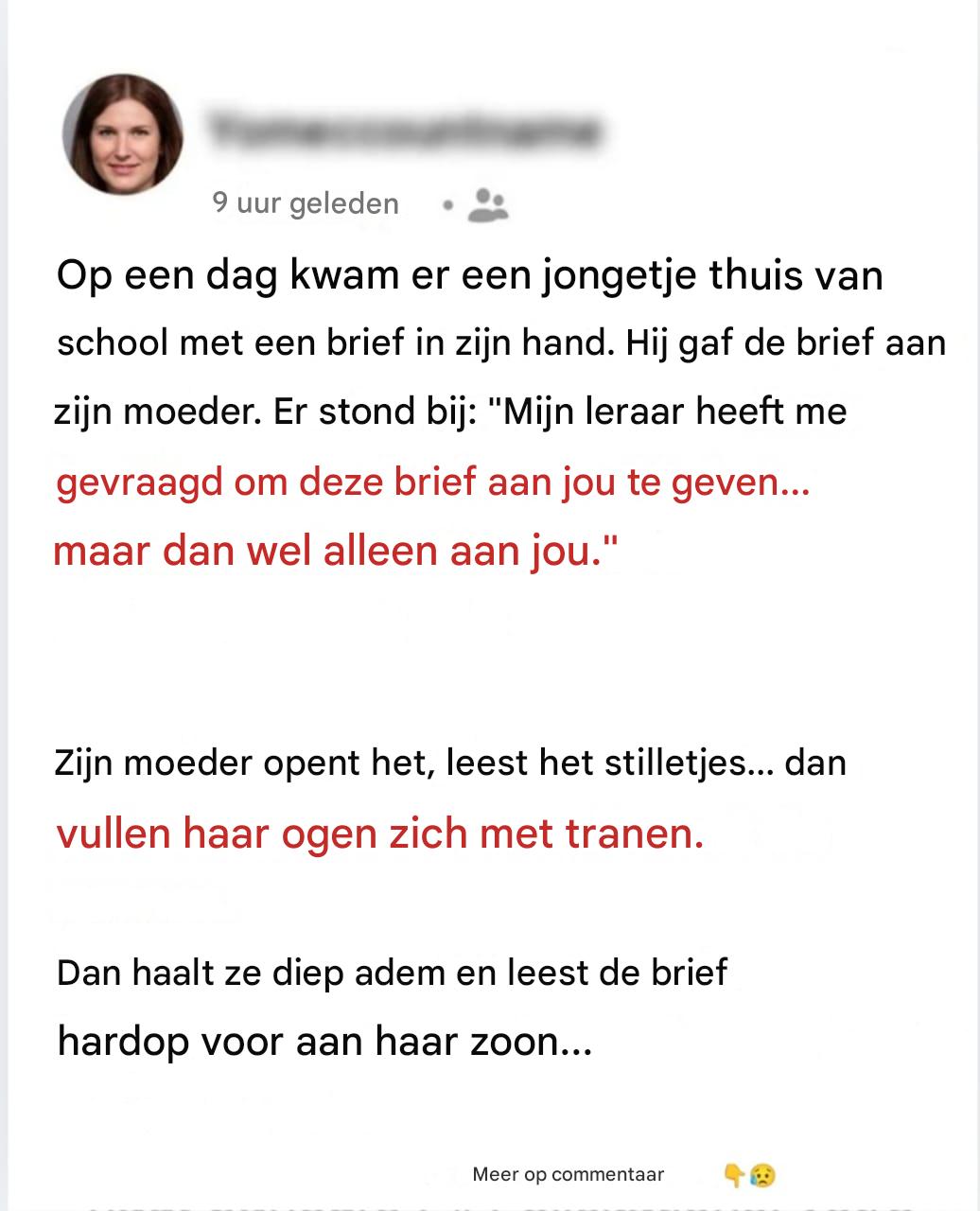 Op een dag kwam een jongetje thuis van school met een brief in zijn hand, die hij aan zijn moeder gaf. De tekst luidde: « Mijn leraar heeft me gevraagd deze brief aan jou te geven… maar dan alleen aan jou. »