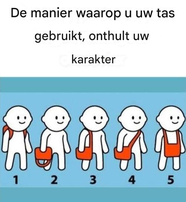Als je je tas liever in je hand draagt, verraadt dit een dominante aanwezigheid en een sterk gevoel van controle. Je hecht waarschijnlijk waarde aan orde en vindt het prettig om de controle over je omgeving te hebben. Deze manier van het dragen van een tas is gebruikelijk bij mensen die oog hebben voor detail en gedijen in omgevingen waar ze hun organisatietalent kunnen oefenen.