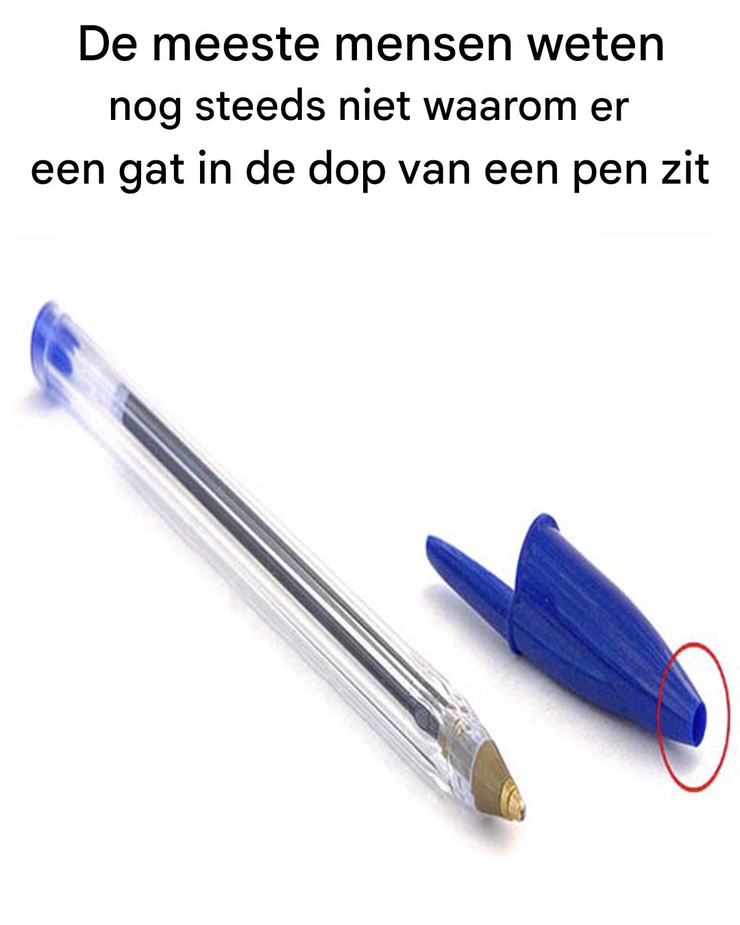 Het is er, onopvallend, bijna onzichtbaar, en toch is het al sinds de basisschool onderdeel van ons dagelijks leven: het kleine gaatje bovenaan de dop van onze pen. We hebben het allemaal gezien. We hebben allemaal wel eens met die kapotte pet gespeeld tijdens een telefoongesprek of een saaie les. Maar wie heeft zich ooit afgevraagd waarom dit beroemde gat bestaat? Achter dit ogenschijnlijk onbelangrijke detail gaat een waar verhaal over veiligheid, vindingrijkheid… en zelfs industriële optimalisatie schuil.