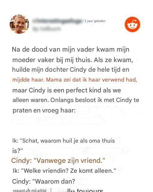 Maar de laatste tijd, wanneer mijn moeder Cindy afzet, huilt mijn dochter de hele tijd en ontwijkt ze haar oma, terwijl mijn moeder me vertelt wat ze gedaan hebben.