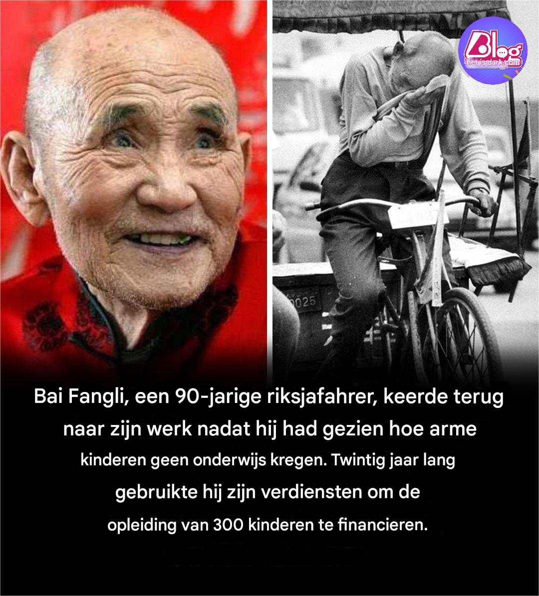 Decennia geleden, op de drukke straten van Tianjin, China, was het gebruikelijk om een oude man langzaam met zijn riksja door de stad te zien fietsen. Zijn naam was Bai Fangli, en voor veel voorbijgangers leek hij misschien een gewone arbeider. Maar achter zijn verweerde handen en stille vastberadenheid lag een van de meest buitengewone verhalen over liefde en opoffering: een man die het laatste hoofdstuk van zijn leven wijdde aan het geven van kinderen de kans op een opleiding die hij nooit had gehad.