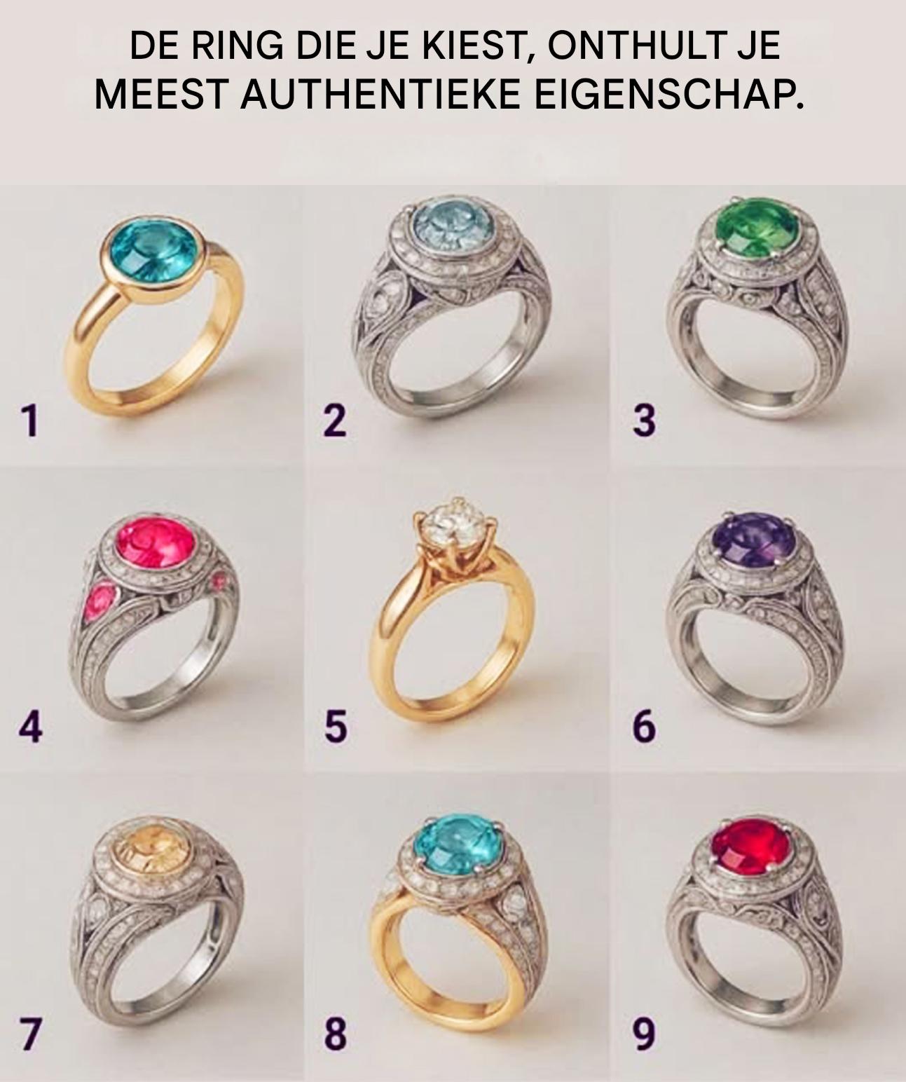 Heb je ooit gemerkt hoe sommige ringen je vanuit een etalage lijken toe te roepen? Alsof hun kleur, hun glans of hun vorm iets diep persoonlijks in je wakker maakt. We denken vaak dat het gewoon een kwestie van esthetische aantrekkingskracht is… maar dat is het niet. Achter elke voorkeur schuilt een klein verhaal, een persoonlijke betekenis, een subtiele weerspiegeling van wie je bent. Dus, welke zou jij instinctief kiezen? En bovenal, wat zou die ring over jou zeggen? Ben je klaar om mee te doen? Je zou wel eens verrast kunnen worden.
