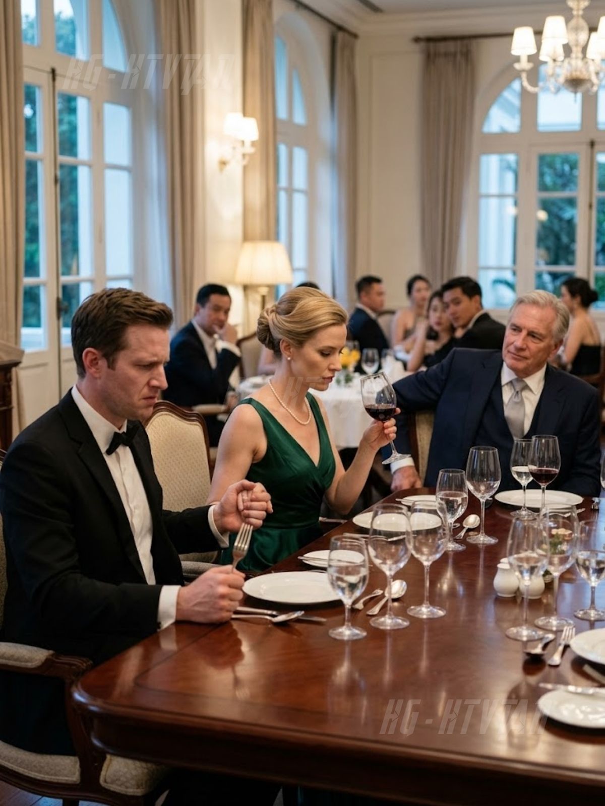 Niet omdat het slecht was. De wijnkelders van Harrington hadden geen slechte wijn op voorraad. Alles in die kamer was zorgvuldig uitgekozen om een verfijning uit te stralen die zo compleet was dat het moeiteloos leek – de karaffen die het licht van de kroonluchter opvingen, het zilveren bestek opgesteld als militaire rijen, de dikke crèmekleurige kaarsen die laag brandden in het midden van de mahoniehouten tafel, het bedienend personeel dat zich in bijna volledige stilte bewoog, alsof ze hadden geleerd om in de buurt van geld te ademen zonder het te verstoren. De kamer zelf was een van die oude privé-eetkamers op het landgoed van Harrington die minder op architectuur leken en meer op een verhandeling over geërfde macht. Olieverfportretten. Sierlijsten. Een open haard die te groots was om decoratief te noemen en te zelden werd gebruikt om praktisch te zijn. Door de hoge ramen achter me strekte het terrein zich uit in de duisternis, met keurig gesnoeide hagen en geduldige stenen, en de suggestie dat alles wat wild was al lang geleden tot gehoorzaamheid was gedwongen.