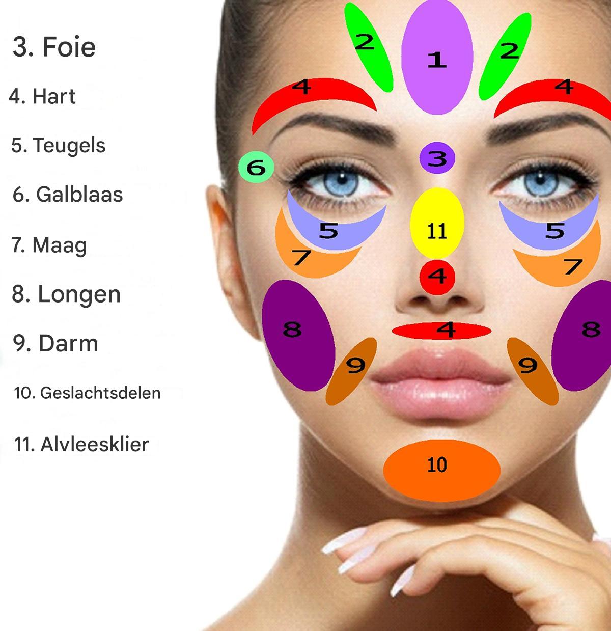 Gezichtsreflexologie is een techniek die helpt de conditie van verschillende organen te verbeteren. Elk punt in ons gezicht vertegenwoordigt een orgaan in ons lichaam, en de toepassing ervan berust in wezen op het uitoefenen van druk op dezelfde punten. De zenuwverbindingen tussen deze punten en andere organen helpen de bloedsomloop te verbeteren en stress te verlichten.
