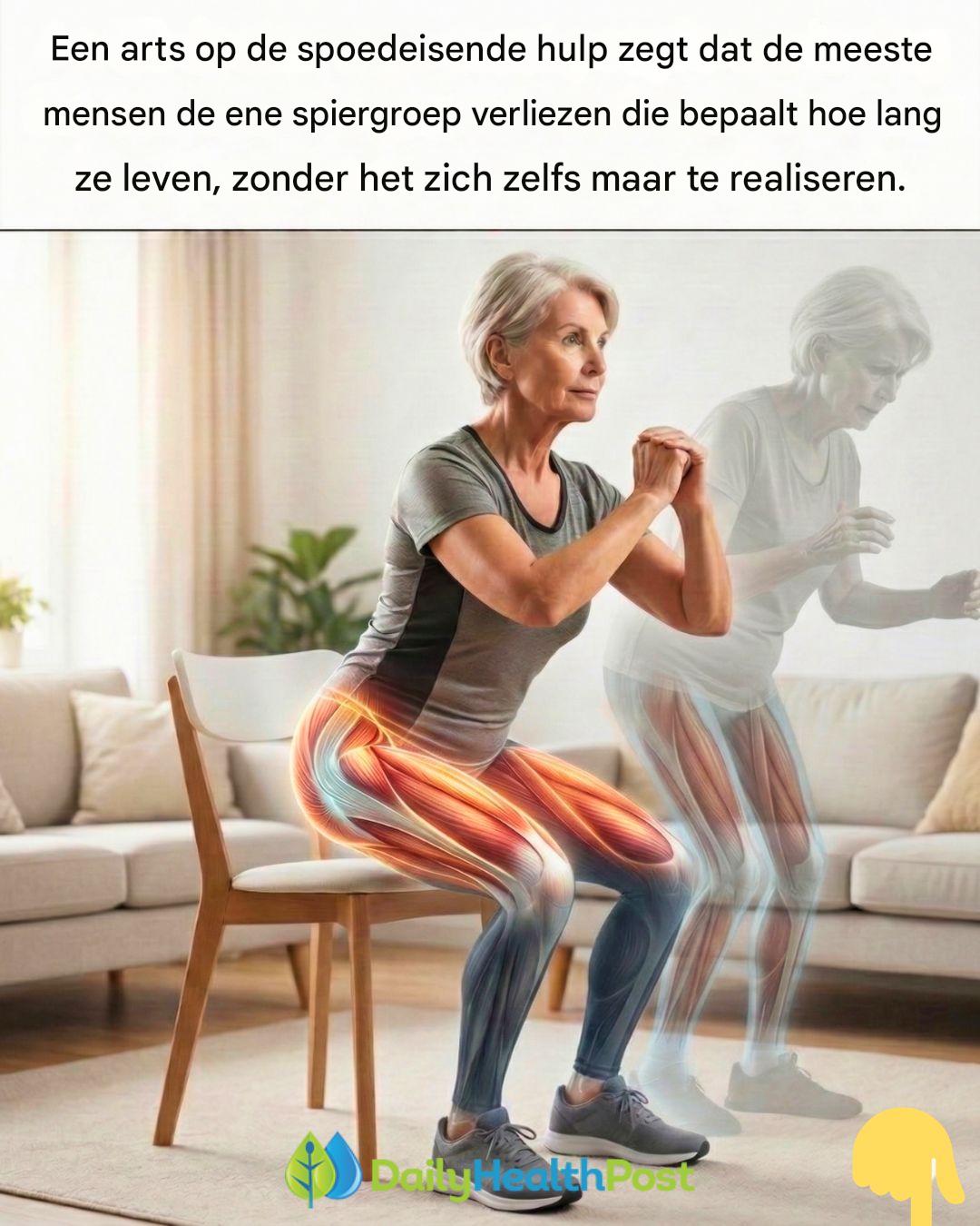 Wist u dat mensen met zwakke benen gemiddeld jonger sterven dan mensen met sterke benen? Dit is geen bangmakerij; het is wat onderzoek ons consequent laat zien. Als arts op de spoedeisende hulp zie ik de gevolgen hiervan dagelijks in de praktijk. Wanneer een oudere persoon na een val op de spoedeisende hulp komt, gaat het verhaal zelden over de val zelf. Het gaat over de decennia van stille, geleidelijke spierafname die de val bijna onvermijdelijk maakte. Dit artikel gaat over de spieren rond uw dijbeen, de kracht die u in staat stelt om zonder uw armen uit een stoel op te staan, en het vitale weefsel dat de meeste mensen elk jaar verliezen zonder het zich te realiseren. Dit is niet zomaar een verhaal over bewegen; het is een verhaal over wat er gebeurt als u niet beweegt, en hoe één simpele beweging uw toekomst ingrijpend kan veranderen.
