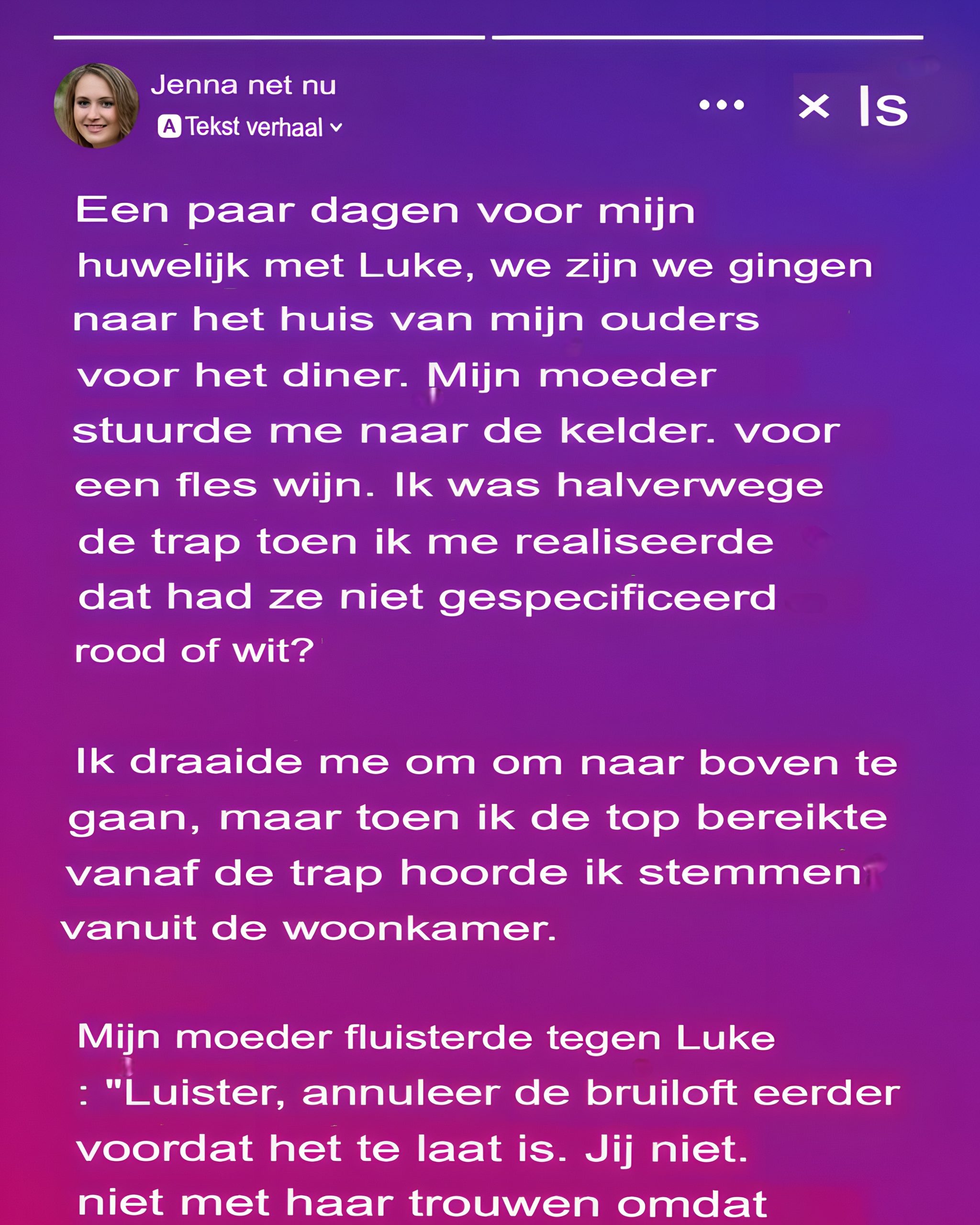 Een paar dagen voor mijn bruiloft ging ik een fles wijn uit de kelder halen. Maar op de trap hoorde ik mijn moeder tegen mijn verloofde fluisteren: « Je moet niet met haar trouwen. » Ik stond verstijfd op de onderste trede en luisterde naar mijn moeder die een geheim onthulde dat ik jarenlang had verborgen.