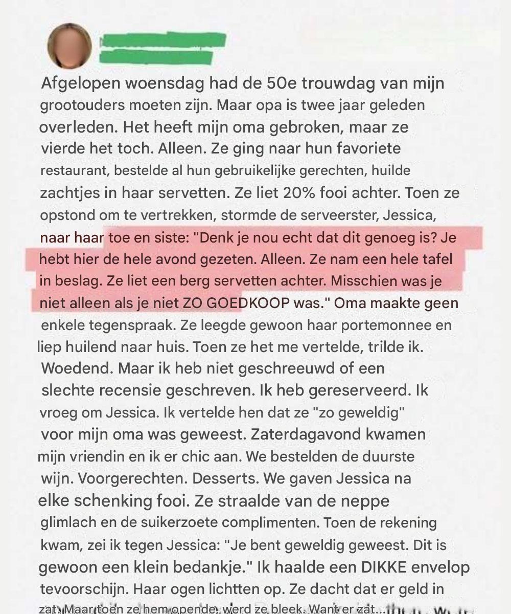Ze spaarde net genoeg voor de busreis, bestelde hun normale lunch en gaf twintig procent fooi – alles wat ze zich kon veroorloven. Jessica, haar ober, maakte echter een venijnige opmerking over waarom ze « alleen was op haar leeftijd » en maakte haar luidkeels belachelijk omdat ze « te weinig » fooi gaf.