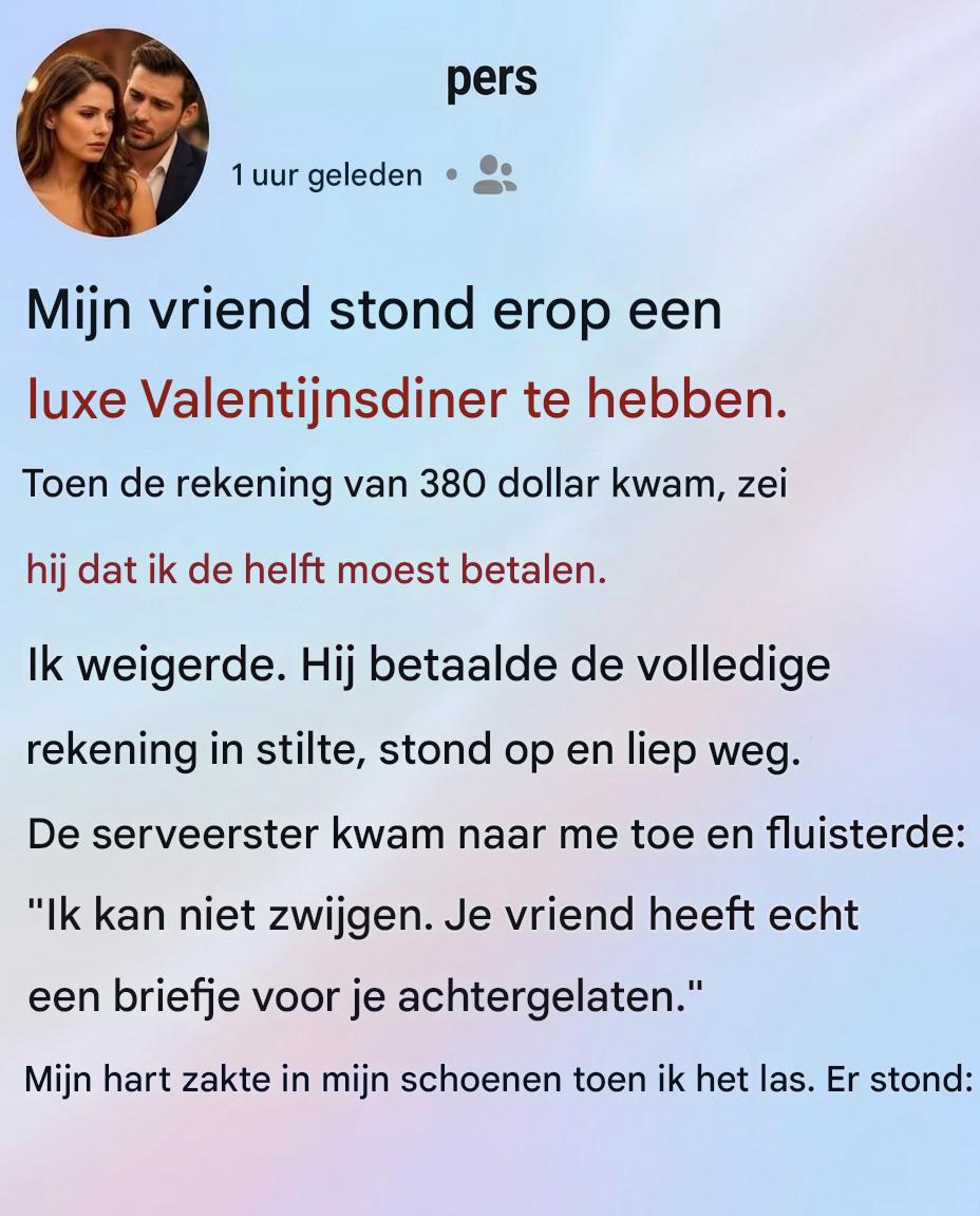 Valentijnsdag had altijd een stille betekenis voor mij gehad, zelfs in de jaren dat de viering niet meer was dan een eenvoudig diner, een klein cadeautje of een handgeschreven kaartje. Ik had nooit geloofd dat de dag grote gebaren nodig had om betekenisvol te voelen; Wat het meest telde, was het gevoel gewaardeerd te worden en tijd te delen met iemand die echt om iemand gaf. Dat jaar besloot mijn vriend echter iets ingewikkelders te doen dan normaal. Een paar dagen voor 14 februari vertelde hij me dat hij een verrassingsdiner had gepland, maar hij wilde niet vertellen waar we naartoe gingen. Toen de avond eindelijk aanbrak, haalde hij me op, formeler gekleed dan ik hem ooit had gezien, glimlachend op een manier die suggereerde dat hij enthousiast was over wat hij had geregeld. Terwijl we door de stad reden, realiseerde ik me dat we op weg waren naar een van de meest elegante restaurants in het centrum, een plek waar ik alleen van had gehoord maar nooit had bezocht. Het restaurant stond bekend om zijn met kaarslicht verlichte tafels, live pianomuziek en verfijnde sfeer die elke avond als een speciale gelegenheid deed voelen. Toen we naar binnen liepen, voelde de sfeer meteen magisch aan. Zachte muziek zweefde door de kamer, obers bewogen zich stilletjes tussen tafels, en warm licht van tientallen kaarsen weerkaatste op het glaswerk en de gepolijste oppervlakken om ons heen. Stellen spraken zachtjes met elkaar terwijl ze genoten van zorgvuldig bereide maaltijden, en alles aan de omgeving leek ontworpen om het perfecte romantische moment te creëren. Toen we gingen zitten, voelde ik me oprecht geraakt dat hij zoveel moeite had gedaan om de avond te plannen. Tijdens het diner verliep het gesprek soepel. We praatten over onze plannen voor de toekomst, lachten om kleine momenten van eerder deze week en deelden verhalen die de avond ontspannen en intiem maakten. Het grootste deel van de avond voelde niets ongewoon of gespannen. In plaats daarvan leek het een van die zeldzame nachten waarop alles perfect op zijn plek viel, waarop twee mensen gewoon van elkaars gezelschap konden genieten zonder afleiding. Ik herinner me dat ik dacht dat de moeite die hij had gestoken in het plannen van het diner de avond nog betekenisvoller maakte, en een tijdlang geloofde ik dat de avond zou eindigen als zo’n herinnering waar je jaren later met warmte en dankbaarheid op terugkijkt.