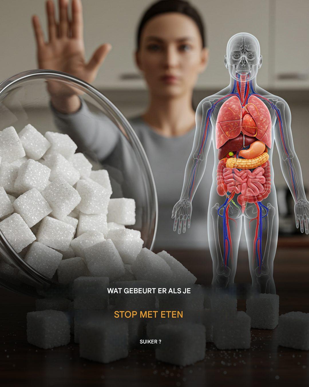 Zodra u suiker uit uw voeding schrapt, begint uw lichaam fundamentele veranderingen door te voeren. Sommige veranderingen zijn goed, andere zijn in het begin wat lastig. In het eerste uur stabiliseert uw bloedsuikerspiegel, omdat uw lichaam de laatste restjes glucose van uw laatste maaltijd verwerkt. Insuline treedt in werking en zorgt ervoor dat de overgebleven suikers als energie worden gebruikt of worden opgeslagen. Zonder voortdurende suikerpieken vermijdt u energiedips, stemmingswisselingen en trek in zoetigheid.