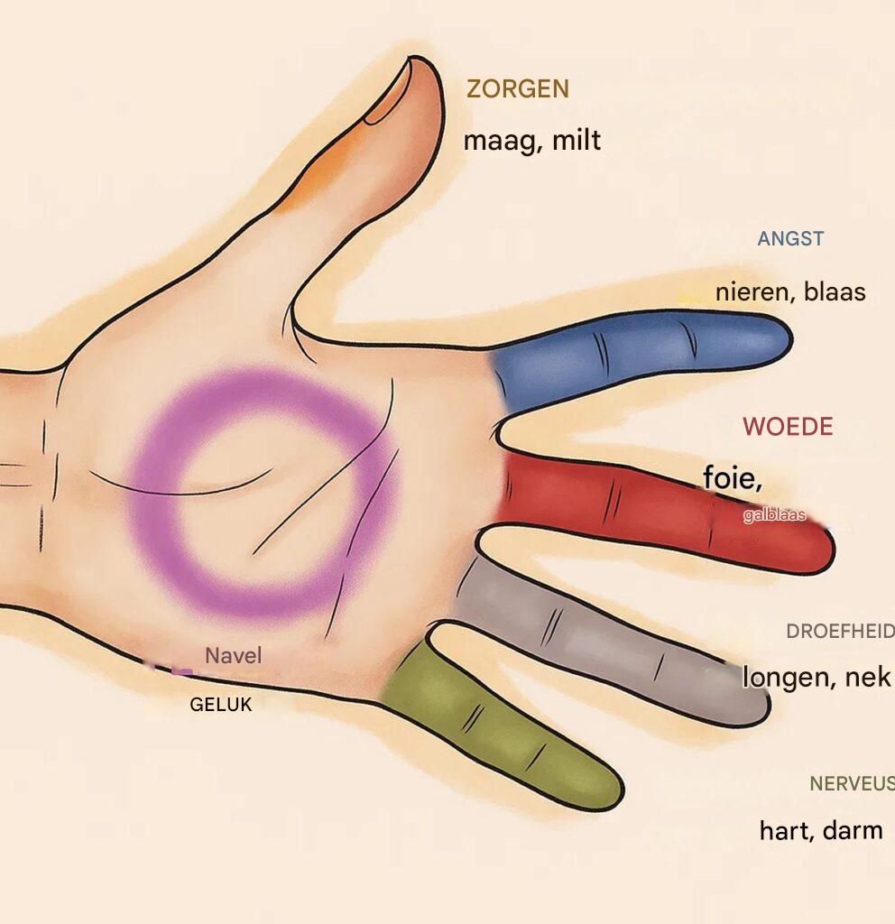 Het basisidee achter deze filosofie is dat elke vinger verbonden is met een specifiek orgaan en een specifieke emotie. Als je besluit om een orgaan te behandelen, oefen dan 3 tot 5 minuten druk uit op het corresponderende punt op je hand en probeer te ontspannen.