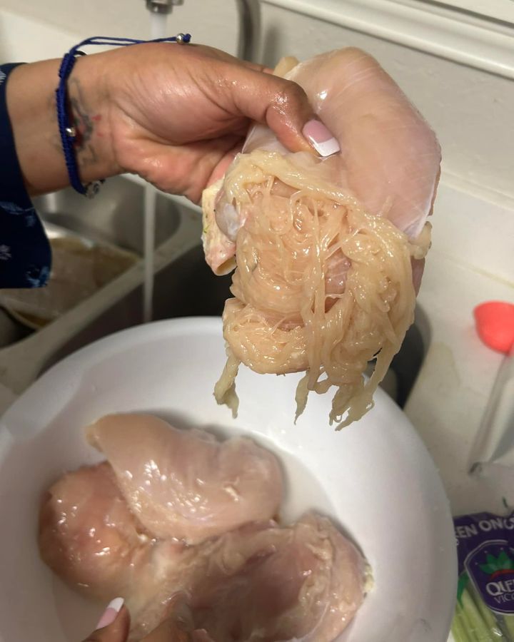 De moeder legde uit dat er die avond geen pasta op het menu stond en deelde een bericht op Facebook waarop te zien is hoe de rauwe kip die ze aan het wassen was, in haar handen uit elkaar valt.