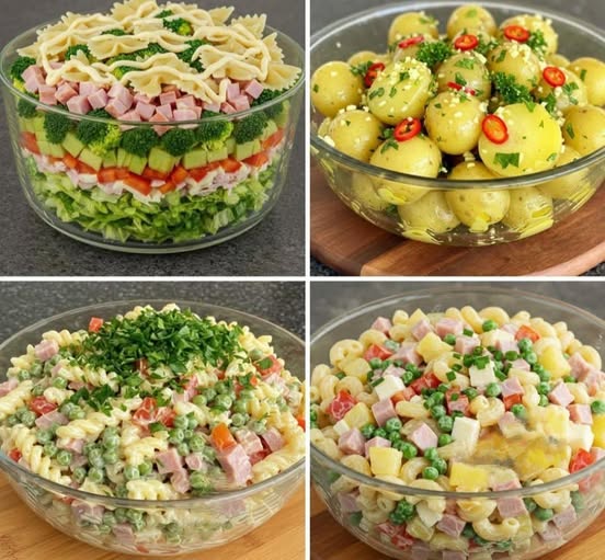 2. Leg de pasta in lagen in een doorzichtige slakom in de volgende volgorde: sla, surimi, paprika, komkommer, broccoli, gekookte ham en pasta.