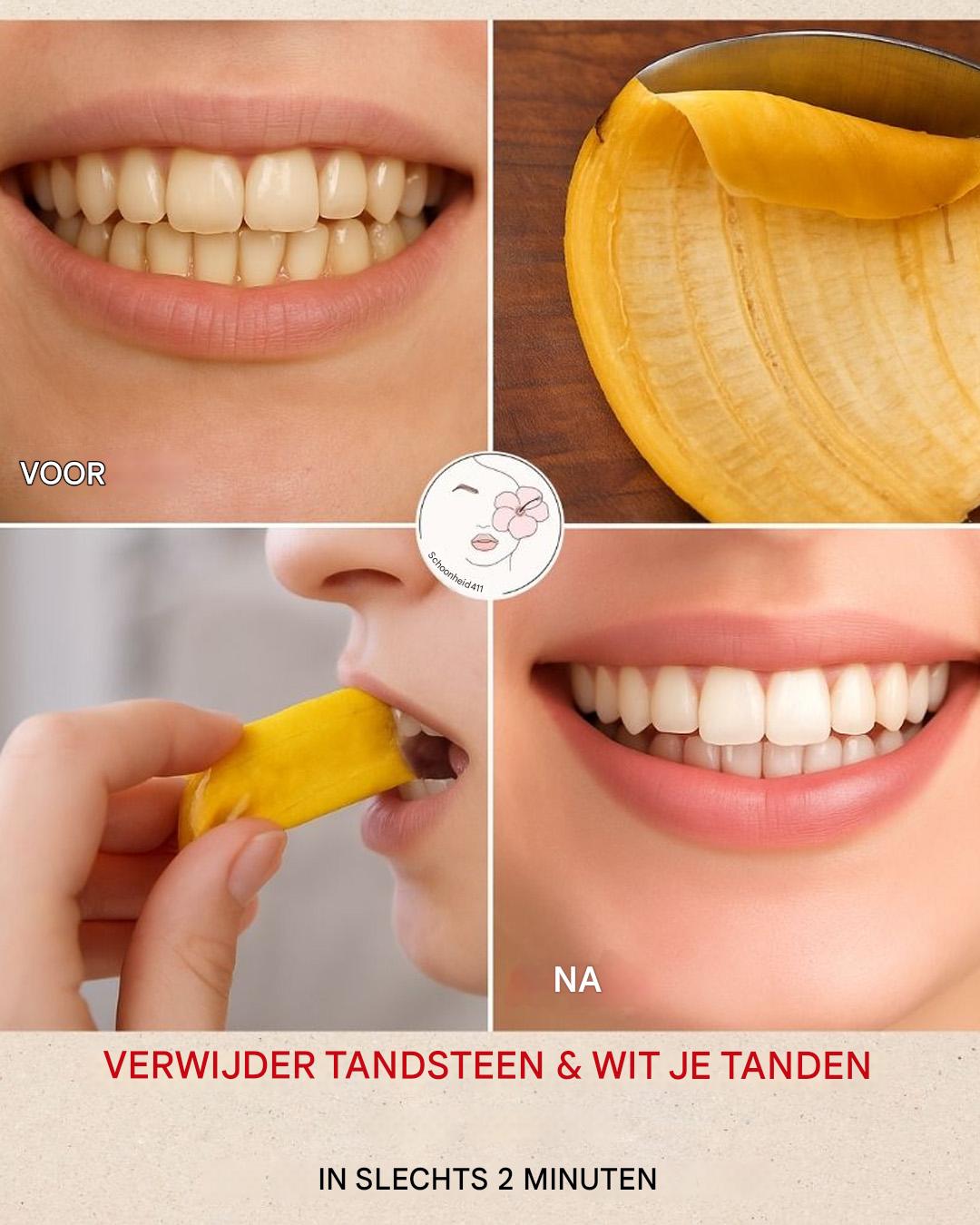 Je hoeft geen schurende oplossingen te gebruiken voor een wittere glimlach. De kalium en magnesium in bananenschillen kunnen je tanden zachtjes polijsten. Wrijf ze twee minuten per dag tegen elkaar: een zachte beweging voor zichtbaar wittere tanden.