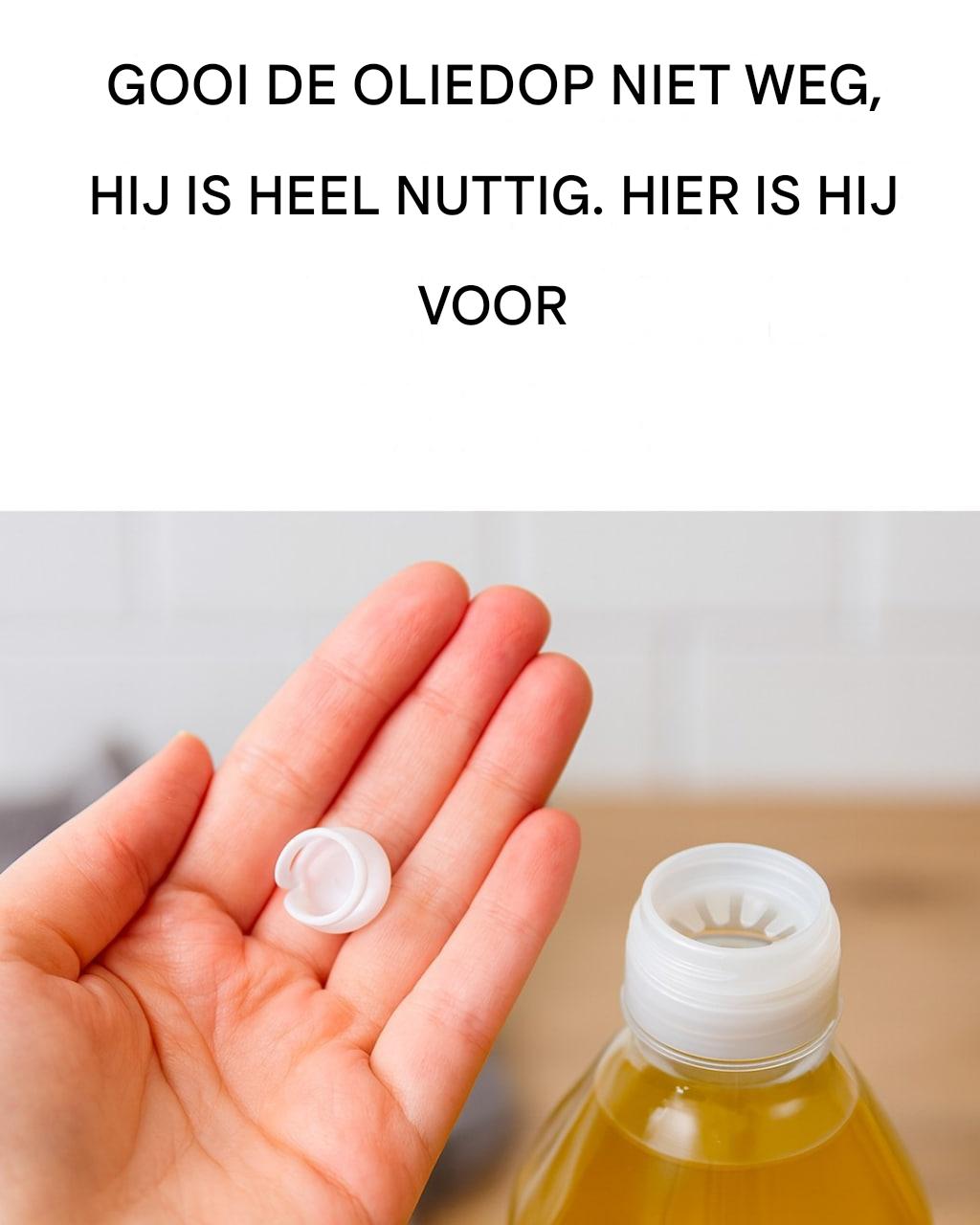 Wanneer je een nieuwe fles olie opent, zie je een plastic afdichtring onder de dop. De meeste mensen gooien die meteen weg – maar doe dat niet!