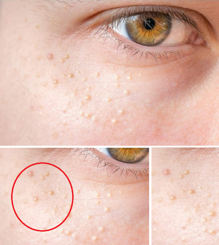 Witte bultjes op het gezicht kunnen milia zijn, een vorm van acne die vaak rond de ogen voorkomt.