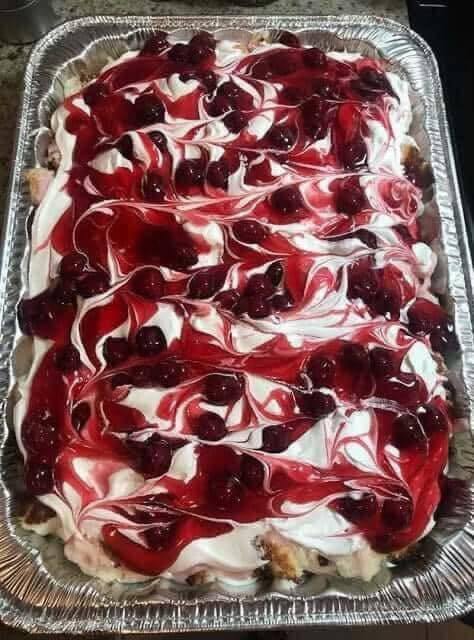 Deze hemelse taart is een eenvoudig dessert zonder bakken dat even makkelijk te maken als heerlijk is. Met zijn laagjes luchtige angel food cake, romige cheesecakevulling en kersentopping is het een heerlijk zoete en verfrissende traktatie, perfect voor een grote groep.