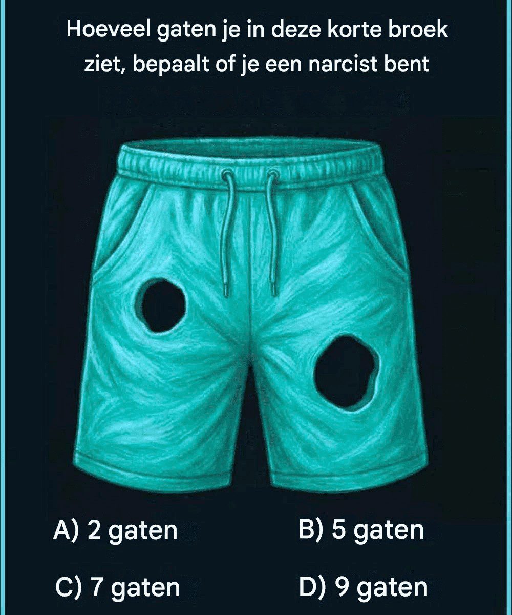 Op het eerste gezicht lijkt deze virale afbeelding niets meer dan een paar beschadigde shorts. Maar zodra je de titel leest – « Hoeveel gaten je in deze shorts ziet, bepaalt of je een narcist bent » – schakelt je brein onmiddellijk over van passief scrollen naar een analytische modus. En dat is precies waarom deze optische puzzel de sociale media heeft veroverd: het daagt je waarneming uit en plaagt tegelijkertijd je ego.