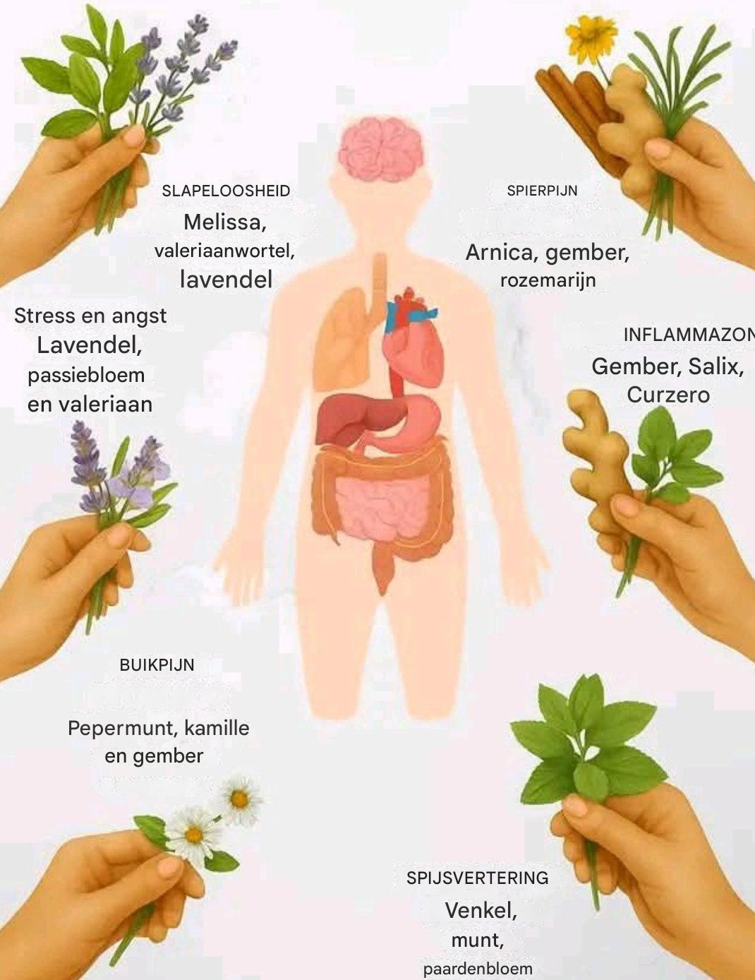 Sinds de oudheid wenden mensen zich tot de natuur voor natuurlijke remedies die pijn verlichten, welzijn bevorderen en de gezondheid bevorderen. De afbeelding « Planten voor genezing » illustreert enkele van de bekendste medicinale kruiden en hun specifieke toepassingen, en biedt een nuttige visuele gids voor het benutten van de therapeutische eigenschappen van de natuur om de kwaliteit van leven te verbeteren. Deze natuurlijke remedies worden al eeuwenlang gebruikt en hebben hun effectiviteit bewezen in het ondersteunen van verschillende aspecten van de gezondheid, van het verbeteren van de slaap tot het verminderen van ontstekingen, van het beheersen van stress tot het behandelen van spijsverteringsstoornissen.