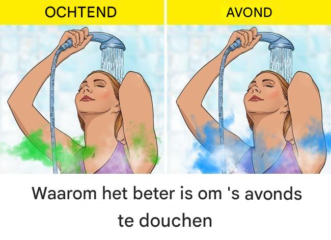 ‘s Avonds douchen kan niet alleen lichaam en geest ontspannen, maar, mits goed getimed, ook de slaapkwaliteit verbeteren. 90 minuten voor het slapengaan douchen met lauw water kan je helpen om ongeveer 10 minuten sneller in slaap te vallen dan normaal. Dit komt doordat warm water je lichaamstemperatuur licht verlaagt, wat je lichaam het signaal geeft dat het tijd is om naar bed te gaan.