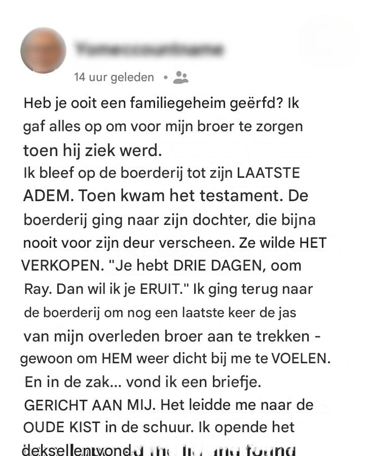 Maar ik had het mis. De echte klap kwam later, toen ik een briefje ontdekte, verstopt in zijn oude schuur, dat een waarheid onthulde die niemand ooit had durven delen.
