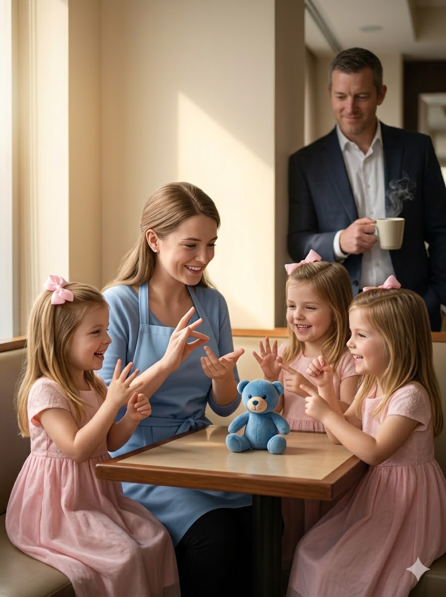 Hij nam zijn dove drielingdochters mee naar zijn werk — wat een serveerster even later deed, liet hem volledig verbijsterd achter.