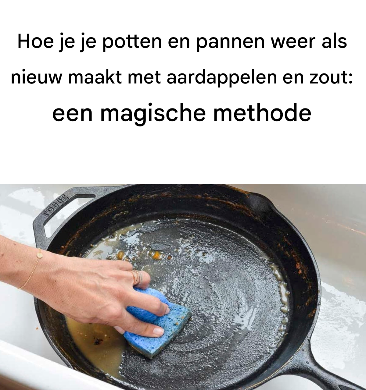 Snijd een aardappel doormidden, bestrooi de ene helft rijkelijk met grof zout en wrijf het direct over de aangetaste plekken van je potten of pannen. Herhaal dit proces tot de oppervlakken schoon zijn.