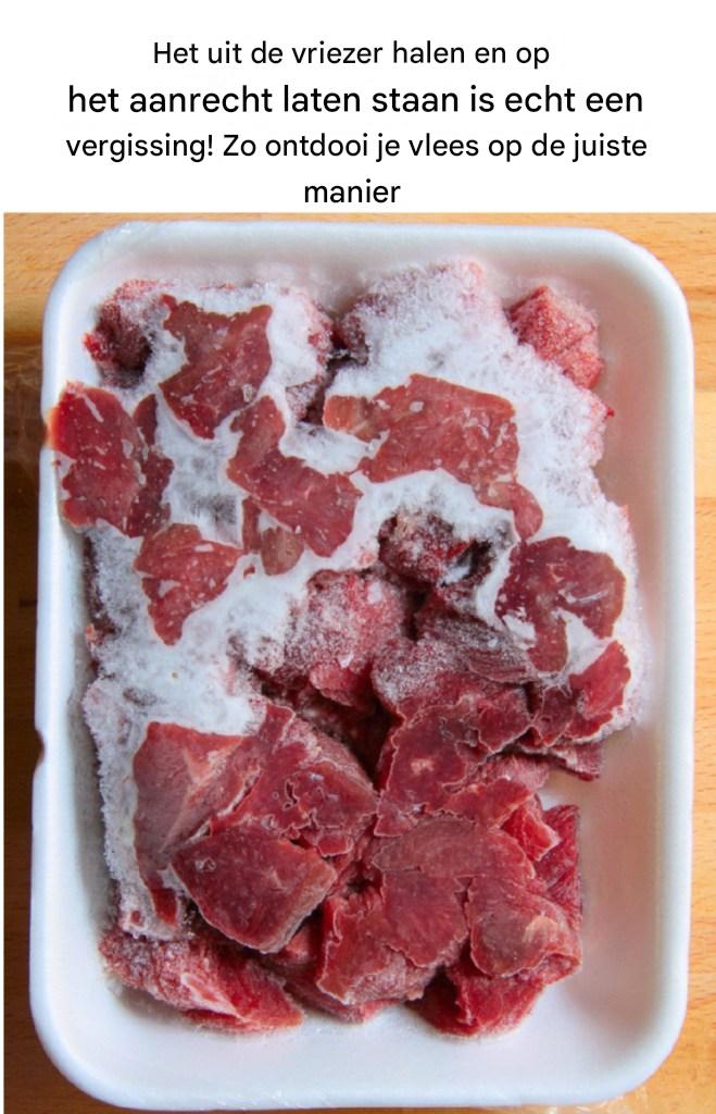 Weet jij hoe je vlees goed ontdooit? Als je vergeet om het vlees op tijd uit de vriezer te halen, is het geen optie om het op kamertemperatuur te laten ontdooien. Sterker nog, het is belangrijk om de koelketen te behouden, want de vriezer stopt de groei van bacteriën, maar elimineert ze niet. De ideale methode is daarom om bevroren vlees – en voedsel in het algemeen – op de onderste plank van de koelkast te leggen, het koudste gedeelte, en het op natuurlijke wijze te laten ontdooien.