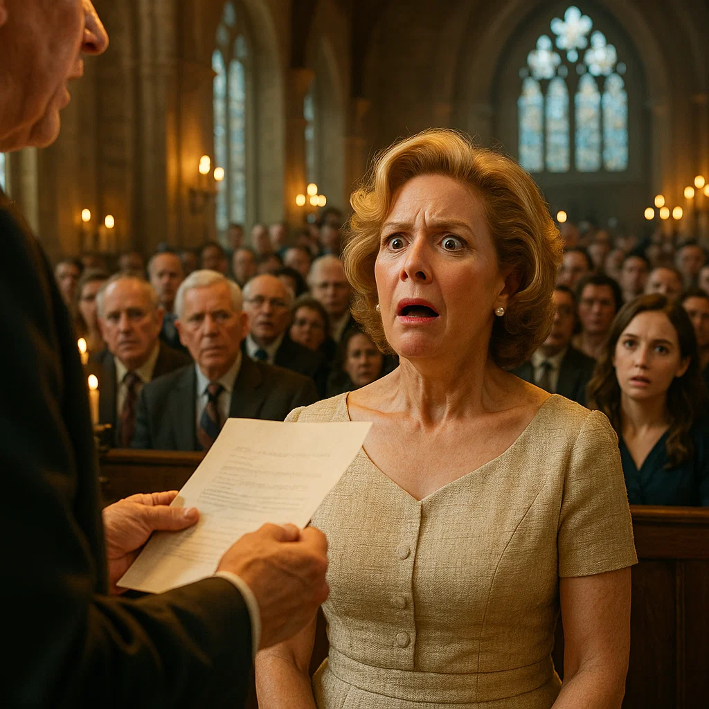 Hij zag haar de kerk uitlopen, fier overeind ondanks de publieke vernedering die ze zojuist had moeten doorstaan. Toen zag hij hoe Eleanor zich binnen haar kring opdirkte met roddels en het huis van God gebruikte als podium voor haar eigen ijdelheid. Een koude, stille woede nestelde zich in zijn hart. Dit was een perversie van alles wat deze gemeenschap moest vertegenwoordigen. Die middag, zittend in zijn stille, met boeken bezaaide kantoor met uitzicht op een bescheiden tuin, besloot hij in actie te komen. Hij ging Eleanor niet zomaar een lesje leren. Hij ging het morele kompas van de hele gemeente herijken met het enige instrument dat hij had en dat zij zou begrijpen: geld. Maar hij zou het gebruiken op een manier die zij nooit zou kunnen doorgronden. Hij pakte de telefoon en belde de senior partner van zijn advocatenkantoor. « Robert, » zei hij kalm en vastberaden. « Ik wil graag een donatie doen aan Grace Chapel. Een aanzienlijke donatie. Maar er zit een heel… specifieke… voorwaarde aan. »