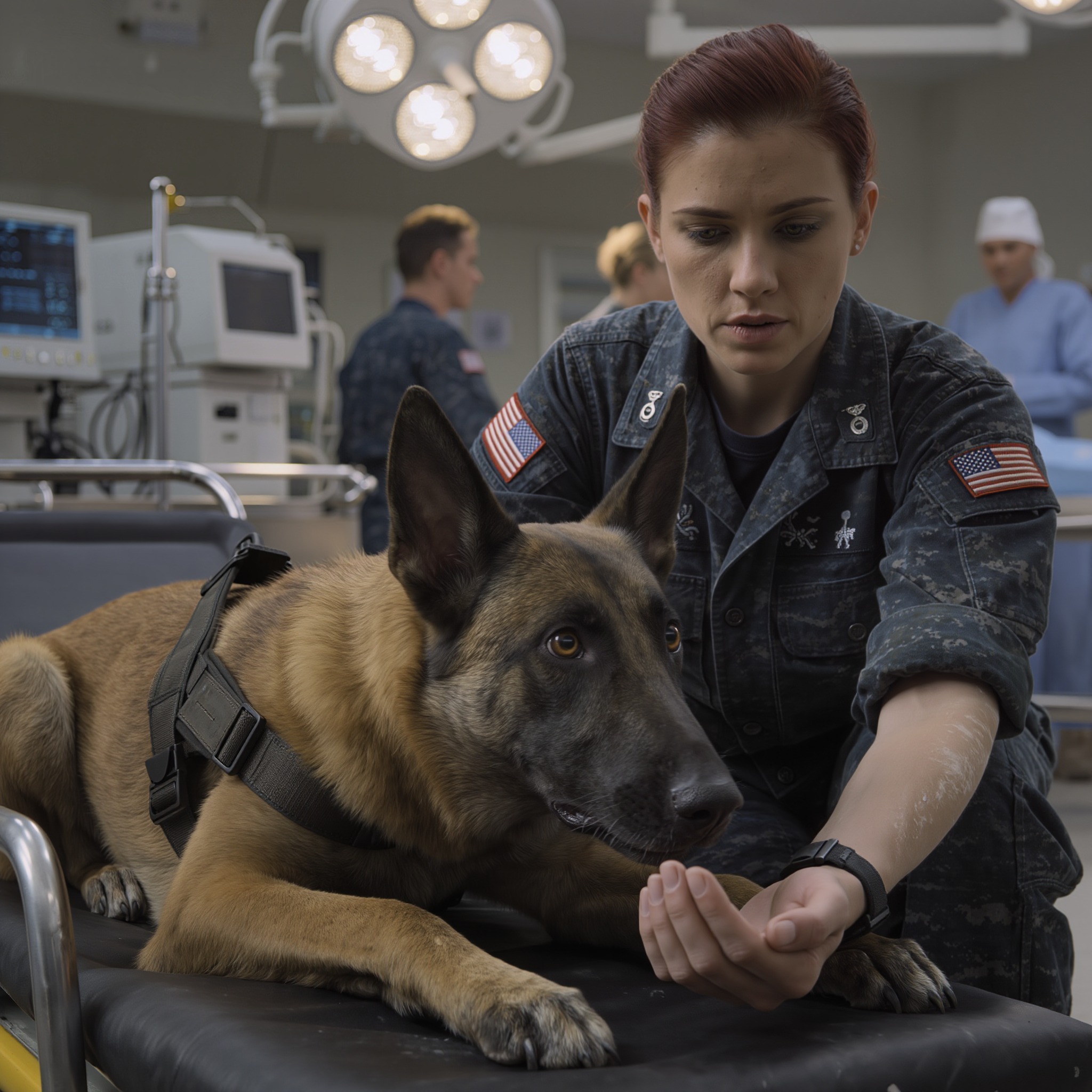 Twee militaire politieagenten kwamen als eerste naar voren, hun laarzen slippend op de tegels, hun uniformen besmeurd met stof en opgedroogd bloed. Tussen hen in, vastgebonden aan een doorgezakte brancard, lag een Belgische Malinois. Niet blaffend. Niet grommend. Alleen maar kijkend – elke schaduw, elke beweging, elke hand die naar hem reikte – als een bom die wachtte tot iemand de draad zou doorklikken.