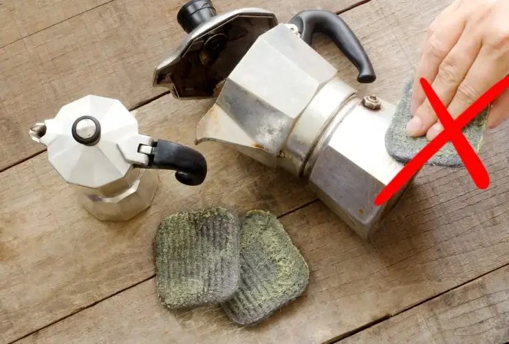 Er werd ons altijd verteld dat we geen zeep mochten gebruiken en dat we het helemaal niet in de vaatwasser mochten doen. Ze hebben gelijk! Reinigingsmiddelen kunnen het metaal beschadigen en stoffen vrijgeven die de smaak van onze koffie volledig veranderen.