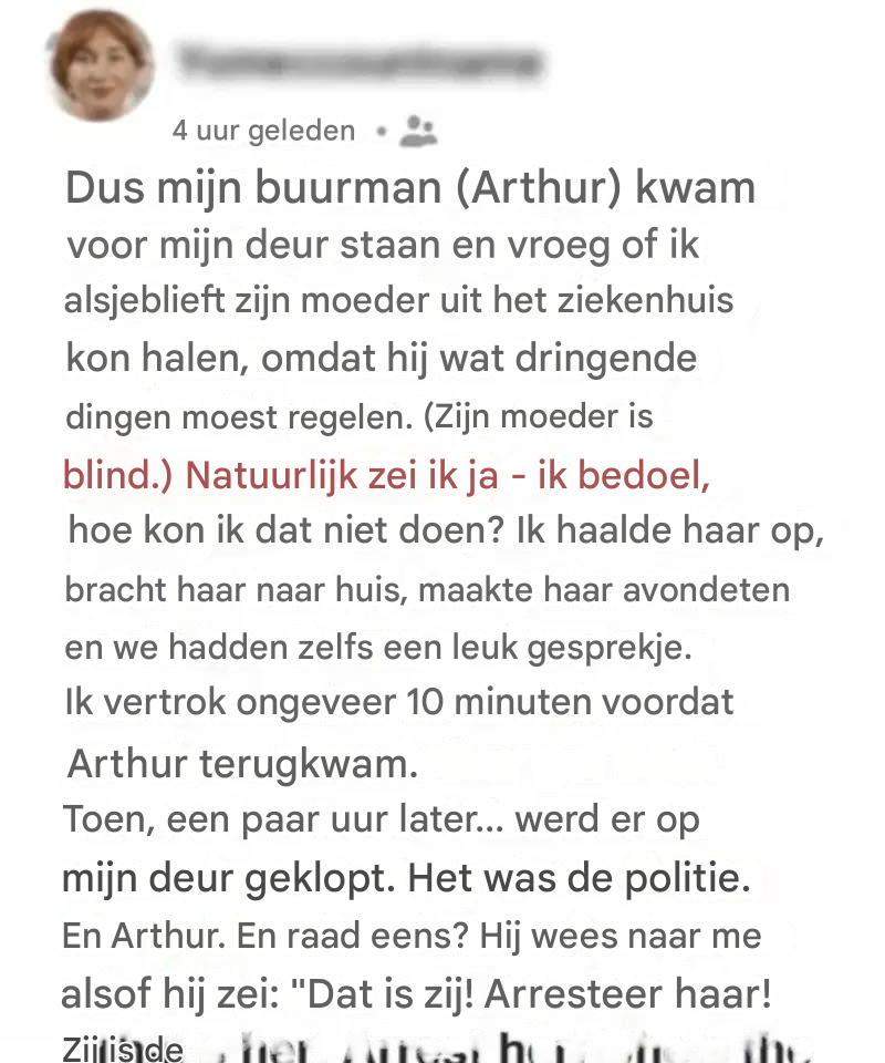 Toen mijn buurman Arthur mij vroeg om zijn blinde moeder Maria op te halen uit het ziekenhuis, stemde ik zonder aarzelen in.