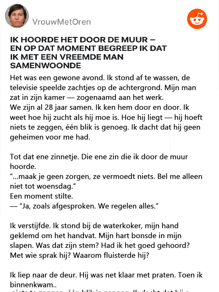 Op dat moment… veranderde alles. De stem die ik al jaren kende, klonk plots vreemd. Zijn blik — hij vermeed die van mij. En toen kwam die gedachte, waar ik eerder bang voor was geweest: misschien weet ik écht niet wie hij is.