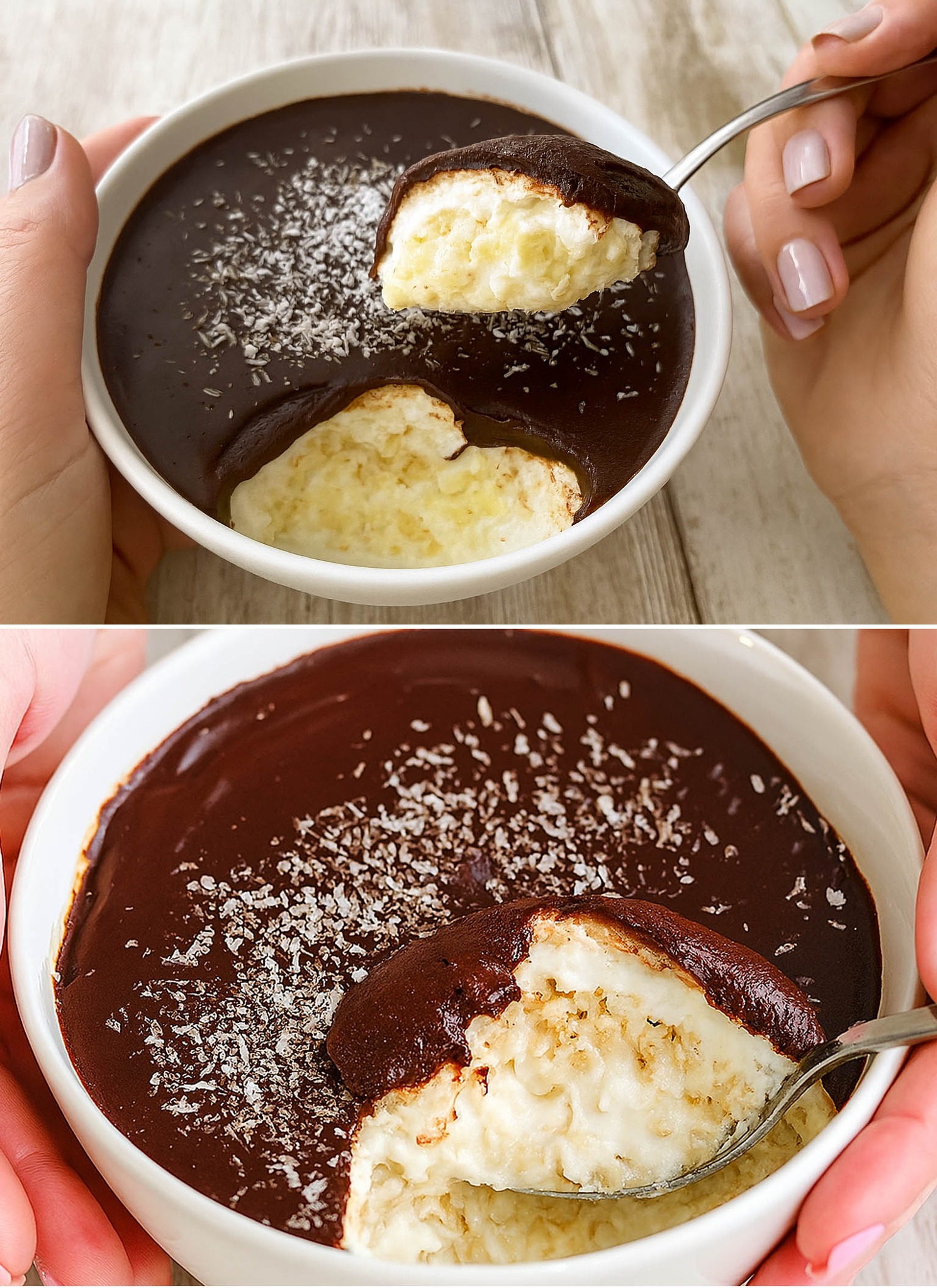 De basis is ongelooflijk simpel: havermout en plantaardige melk. Dan een laag kokos-Griekse yoghurt en daarbovenop een romige cacaosiroop die bijna een soort ganache is. Het geheel wordt in de koelkast gezet om op te stijven: het wordt steviger, neemt smaak aan en de volgende dag… is het onweerstaanbaar.