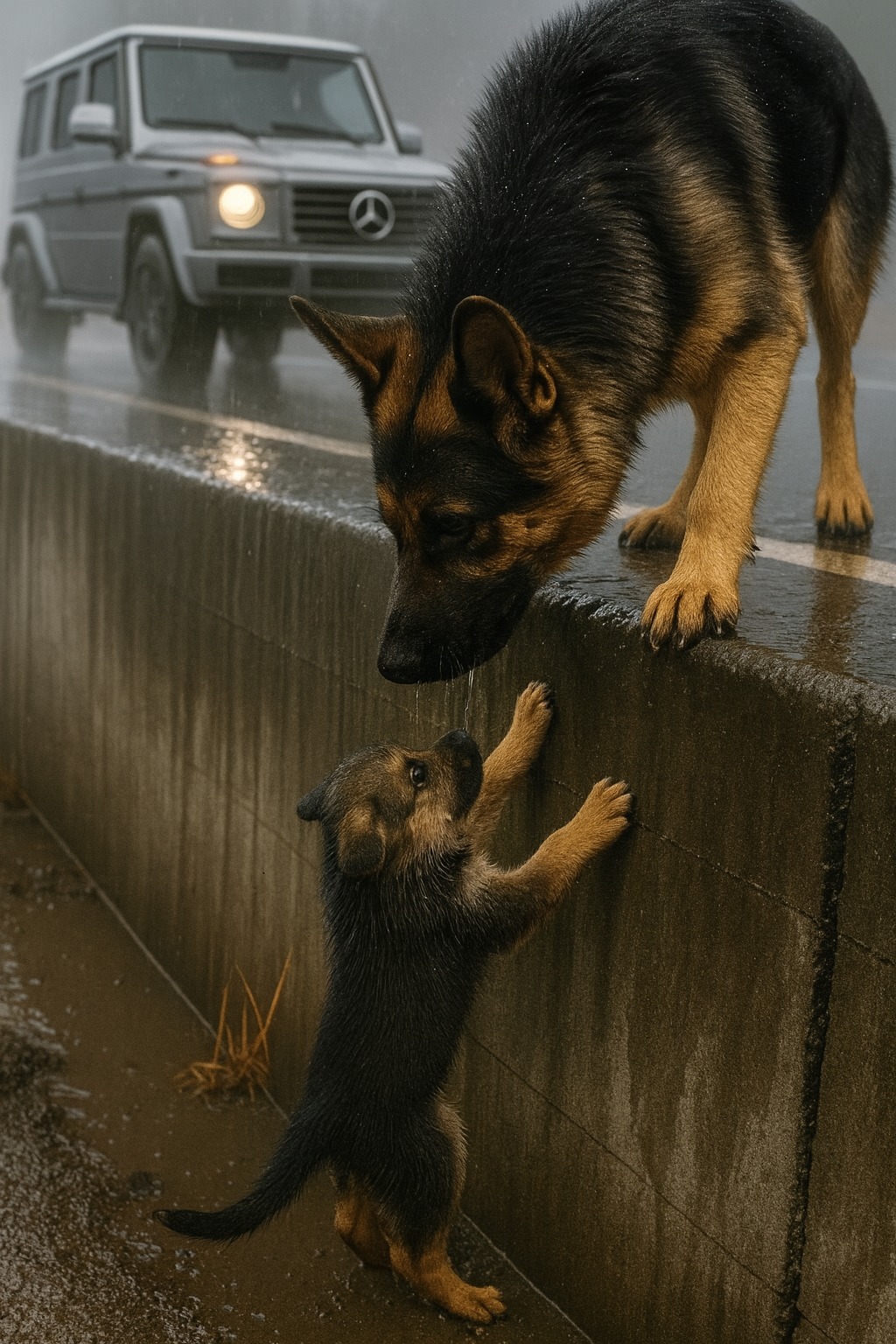 Beneden bij de muur worstelde een piepklein puppy hopeloos om weer omhoog te klimmen. Zijn poot was onhandig verdraaid, duidelijk gewond, en elke poging eindigde ermee dat hij terug in de modder gleed.