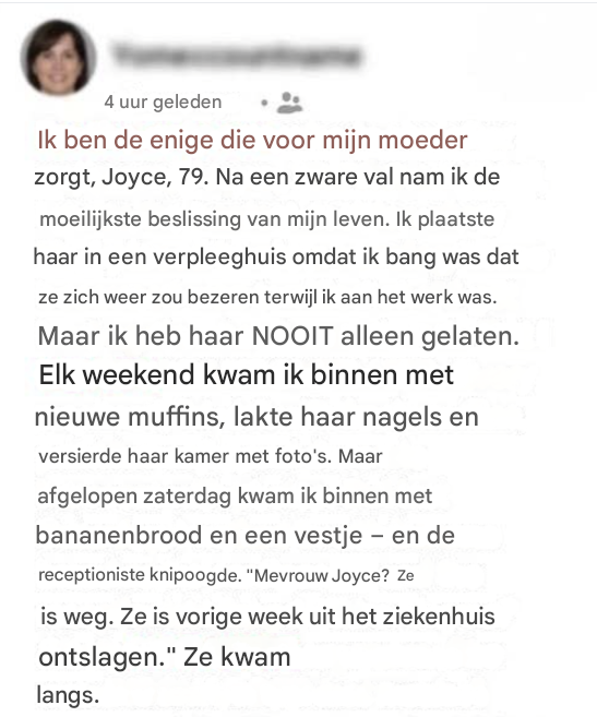 Ik ben de enige die voor mijn moeder, Joyce, van 79, zorgt. Nadat ze was gevallen en haar heup had gebroken, nam ik de moeilijkste beslissing van mijn leven: ik liet haar opnemen in een verpleeghuis. Ik was bang dat ze zichzelf weer zou bezeren terwijl ik aan het werk was.